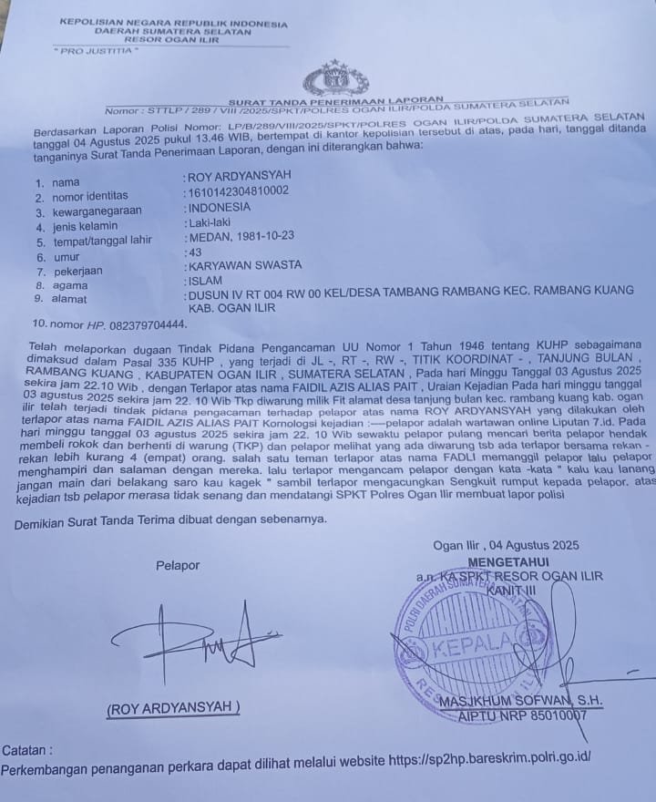 Ogan Ilir –  Roy Ardyansyah (43), seorang jurnalis sekaligus anggota Persatuan Pewarta Warga Indonesia (PPWI) Kabupaten Ogan Ilir, resmi melaporkan dugaan tindak pidana pengancaman ke Polres Ogan Ilir. Laporan tersebut teregistrasi dengan nomor: STTLP/289/VIII/2025/SPKT/POLRES OGAN ILIR/POLDA SUMATERA SELATAN. Senin (04/08/25).