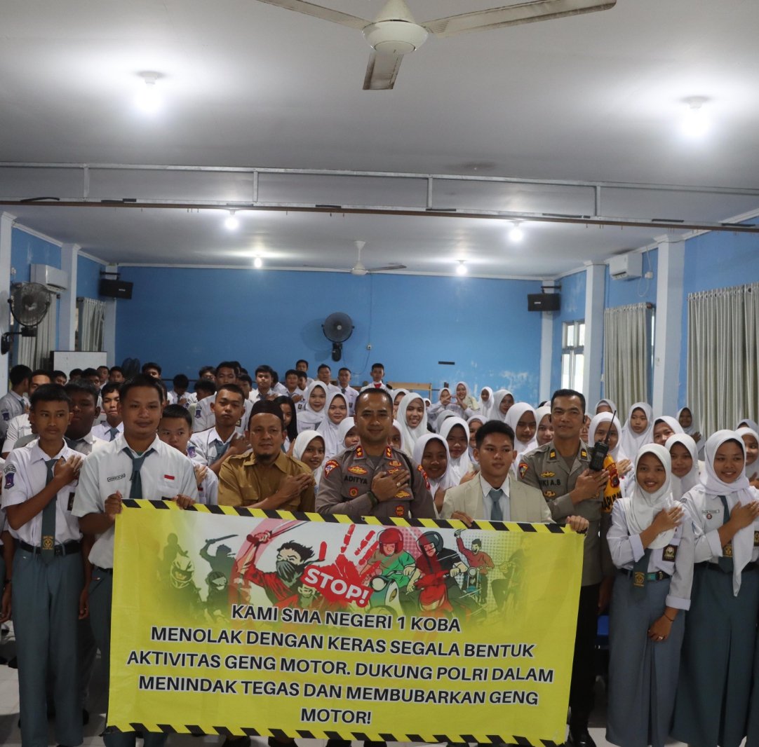 Koba – Kapolres Bangka Tengah, AKBP Pradana Aditya Nugraha, memimpin langsung sosialisasi dan deklarasi penolakan aktivitas geng motor di SMAN 1 Koba, Senin (20/01/2025).