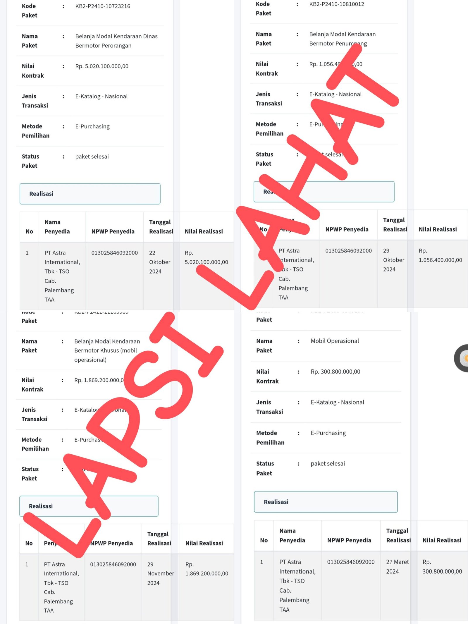 Berdasarkan data yang diperoleh LSM LAPSi, tercatat lima pengadaan kendaraan dengan total nilai fantastis mencapai Rp 8.863.600.000 hanya dalam tahun 2024! Dan yang lebih mencengangkan, hampir seluruhnya diborong oleh satu perusahaan saja: PT Astra International Tbk – TSO Cabang Palembang.