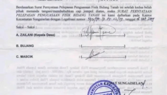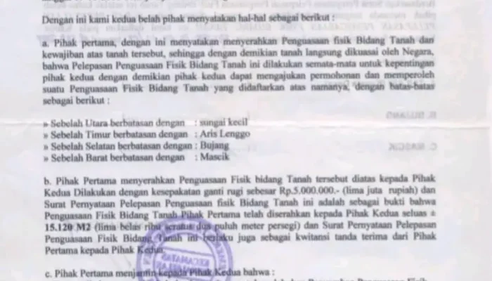 Surat pernyataan pelepasan hak penguasaan fisik tersebut menurut Aris Lenggo dikeluarkan oleh pihak Kecamatan Sungai Selan pada tanggal (01/08/2009) dengan luas bidang tanah lebih kurang 15.120 meter persegi.