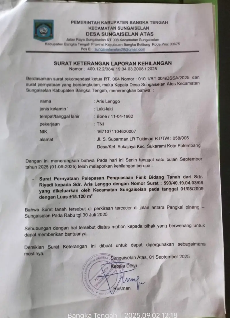Menurut Aris Lenggo, surat pernyataan pelepasan hak penguasaan fisik tersebut hilang lantaran tercecer antara jalan Pangkal Pinang- Sungai Selan, Rabu (30/7/2025).
